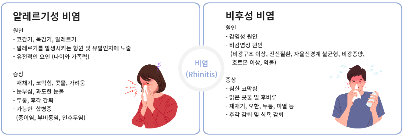 - 점막비후 또는 비갑개골이 비후되고, 이차적으로 코막힘, 콧물, 후각장애 등이 발생할 수 있습니다.