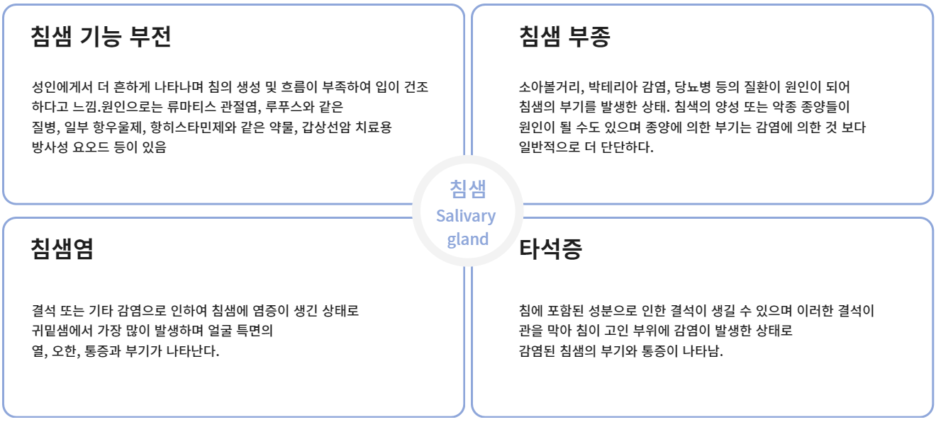 귀밑샘, 혀밑샘, 턱밑샘의 세쌍의 주요 침샘이 있으며, 이외에도 더 작은 침샘들이 입과 인두벽에 있습니다.